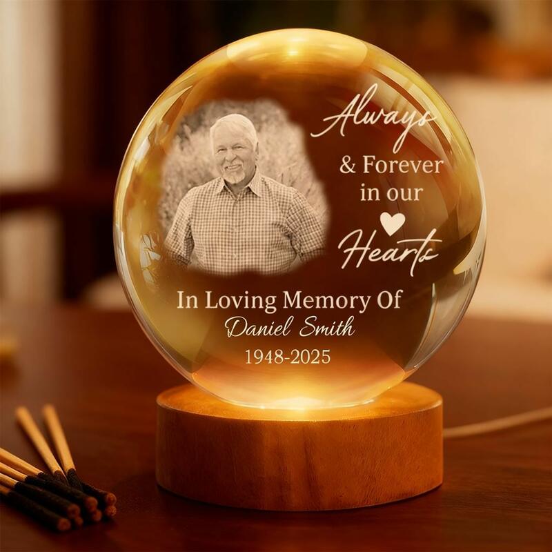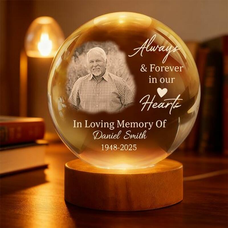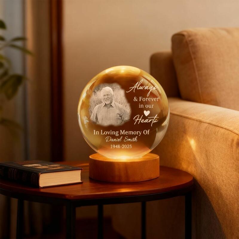 Lámpara de globo de cristal con foto personalizada "Siempre y para siempre en nuestros corazones" Regalo conmemorativo para la familia