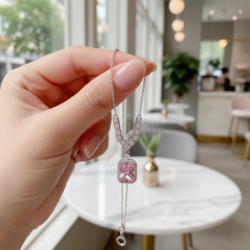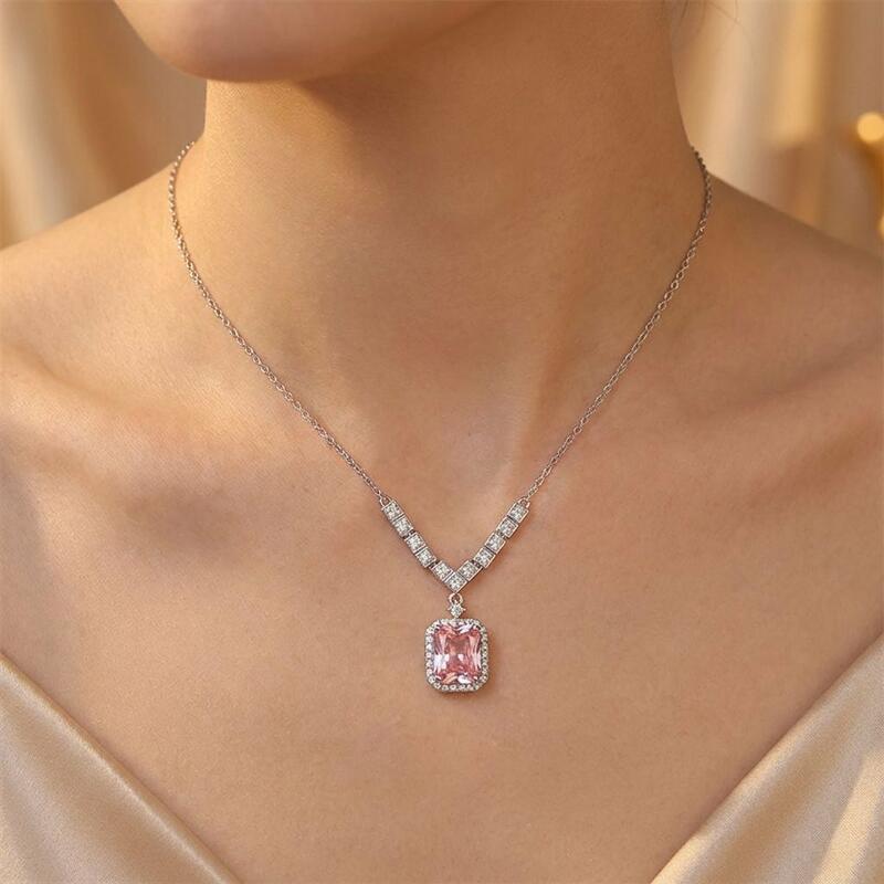 Collar con colgante rosa de moissanita de plata de ley diseño de cadena en forma de V un regalo para mamá