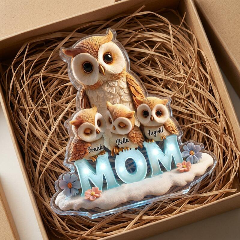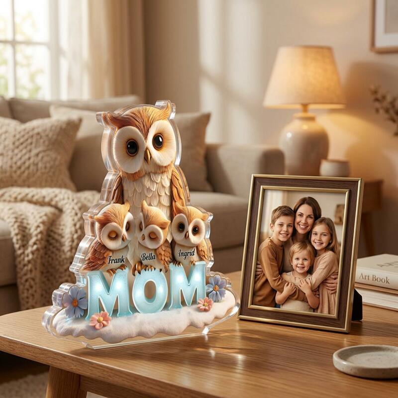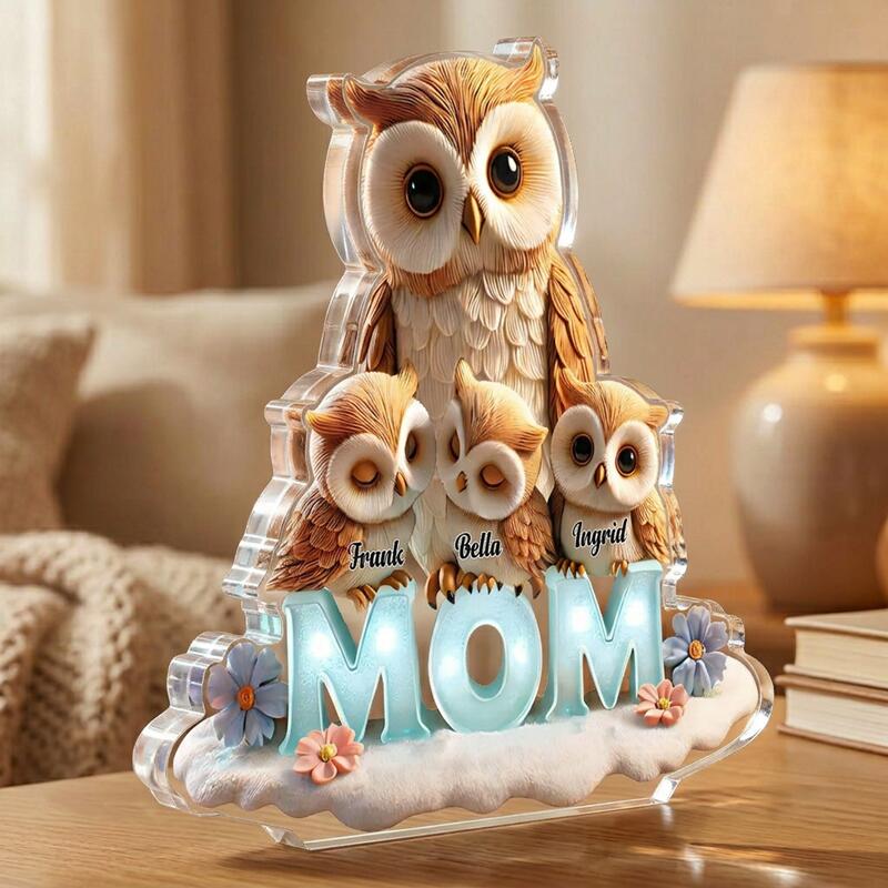 Placa de bloque acrílico personalizada búho de dibujos animados personalizado y diseño de nombre de niños regalo lindo para querida mamá