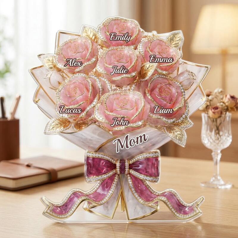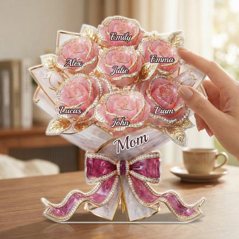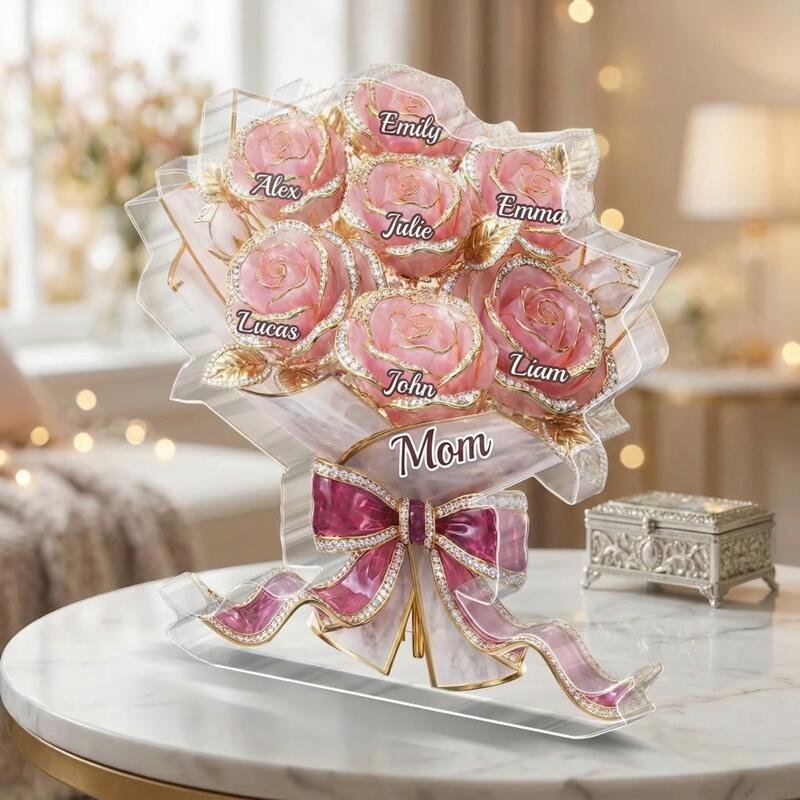 Placa de bloque acrílico personalizada nombres personalizados exquisito diseño de ramo rosa regalo para el día de la madre