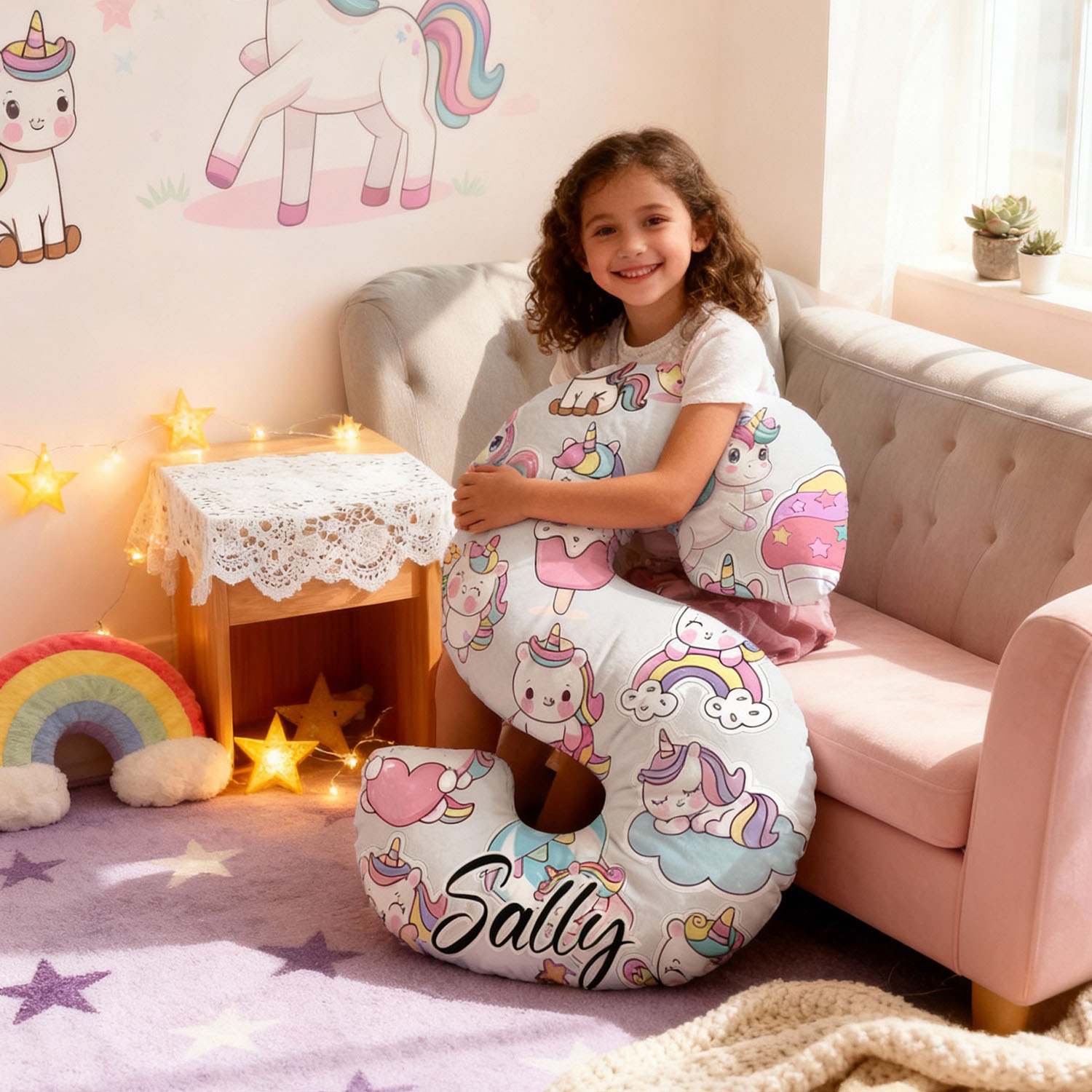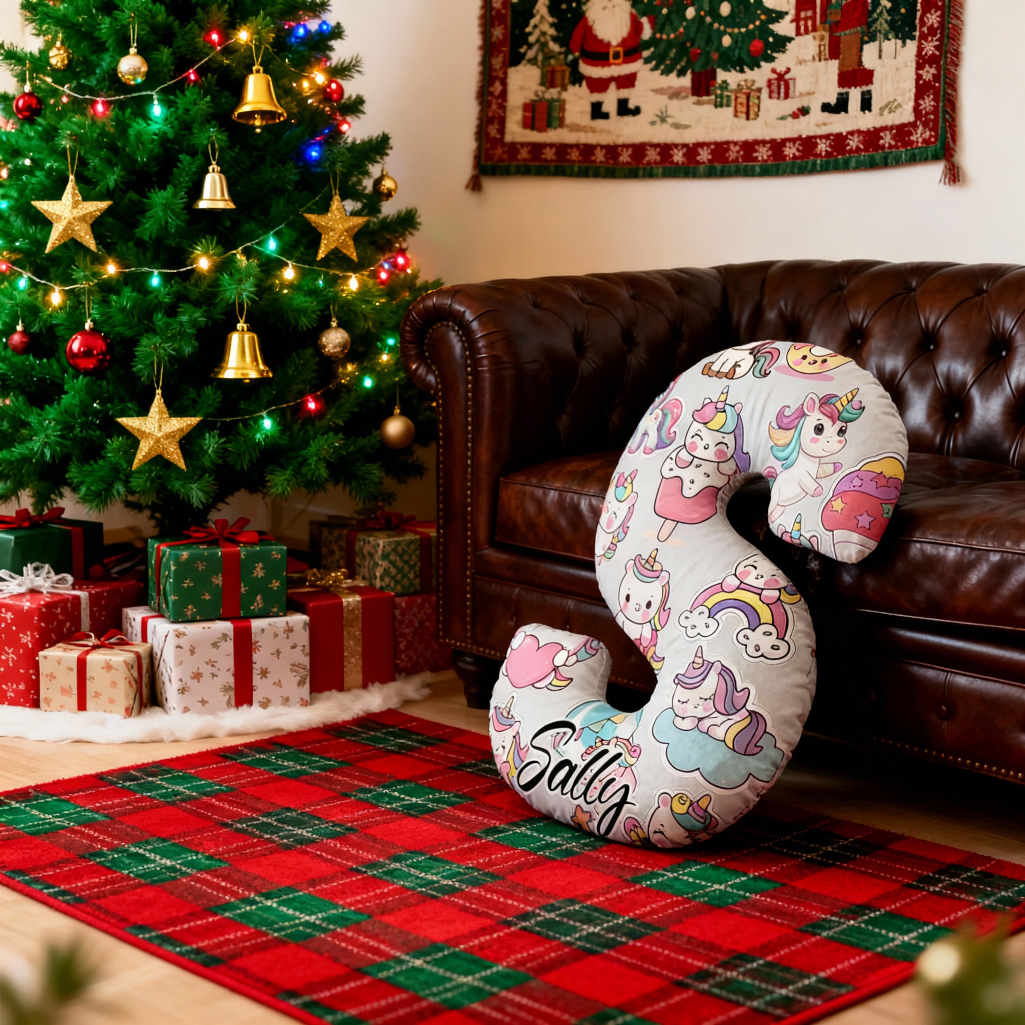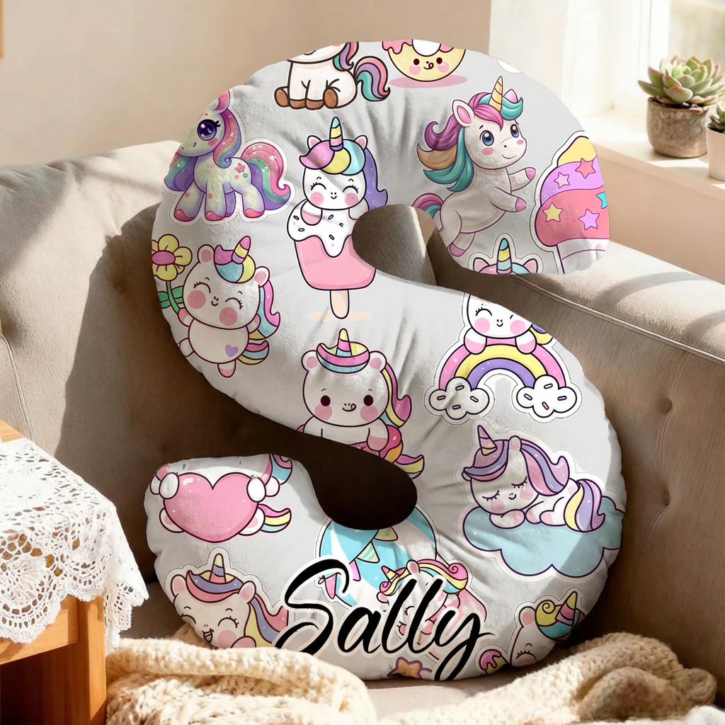 Almohada con letras de unicornio de dibujos animados personalizada, regalo de Navidad para niños