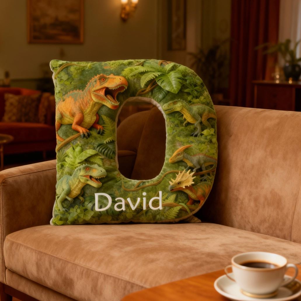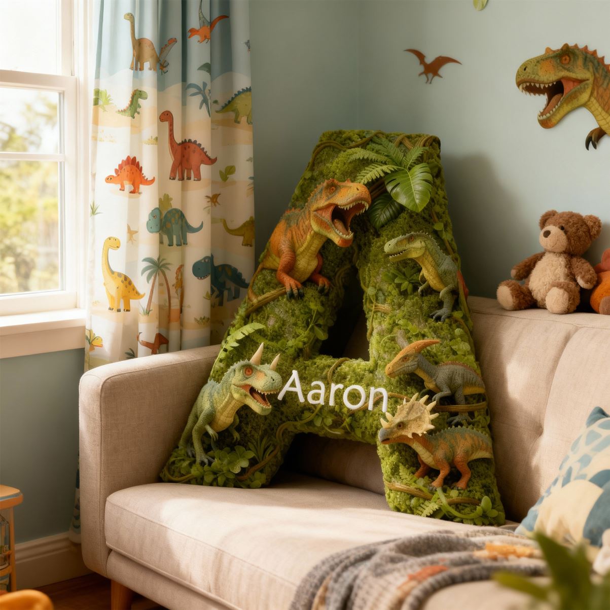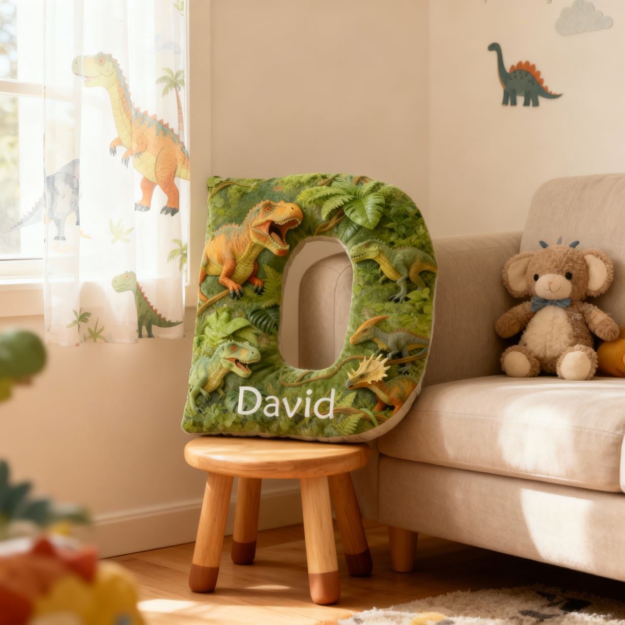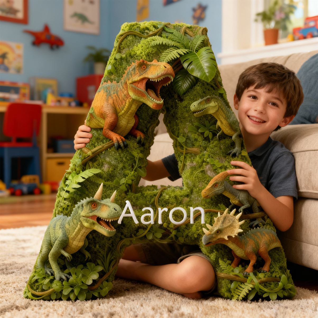 Almohada de peluche personalizada con letras de dinosaurios y estampado de bosque primigenio para niños
