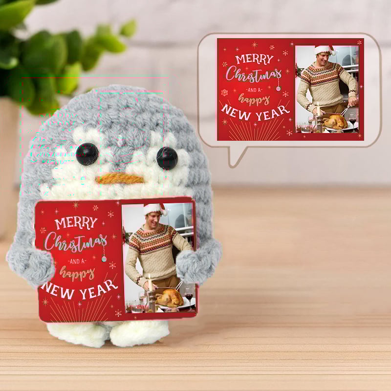 Muñeca de crochet personalizada hecha a mano con tarjeta de imagen personalizada, regalo único para Navidad.