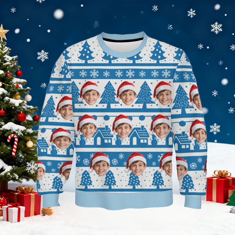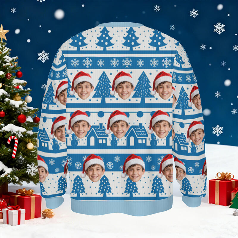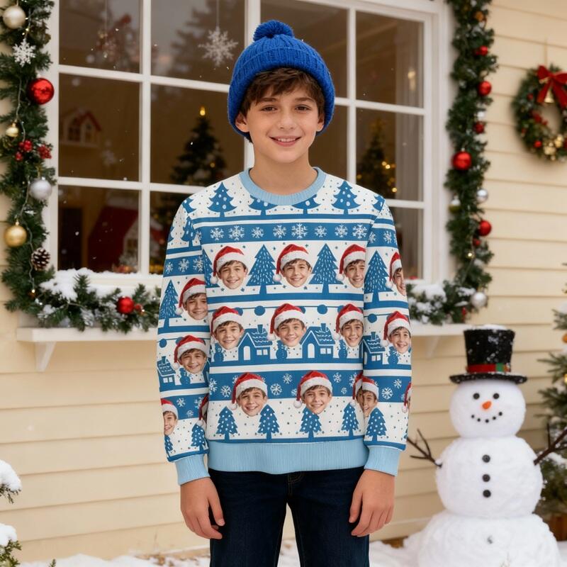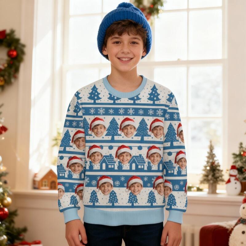 Suéter feo personalizado para niños, unisex, con foto de cara personalizada, diseño azul nevado, regalo perfecto para Navidad.