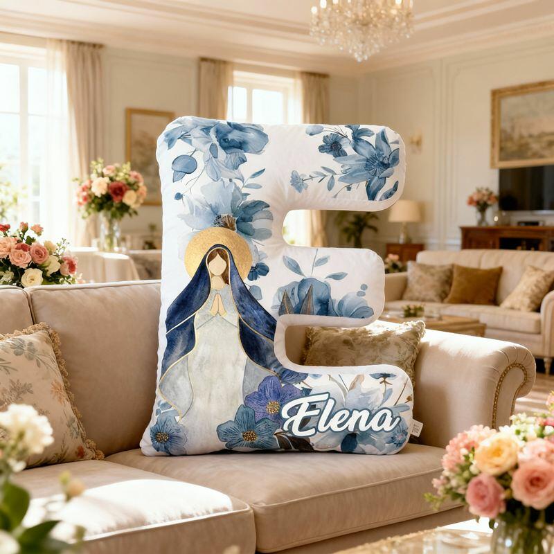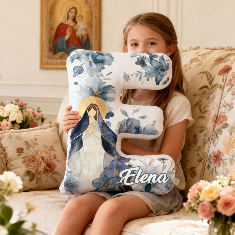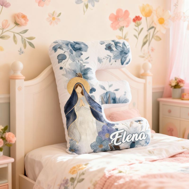 Almohada personalizada con forma de letra de la Virgen María, elegante diseño floral, regalo religioso para niños