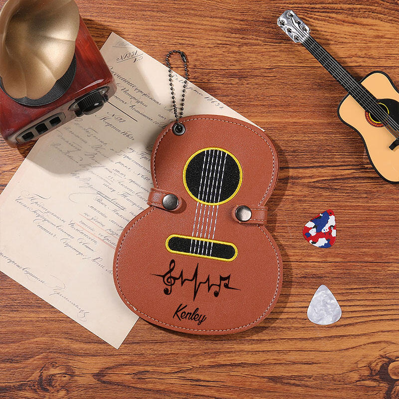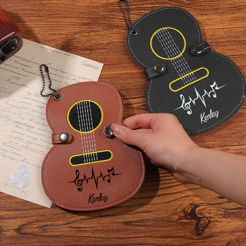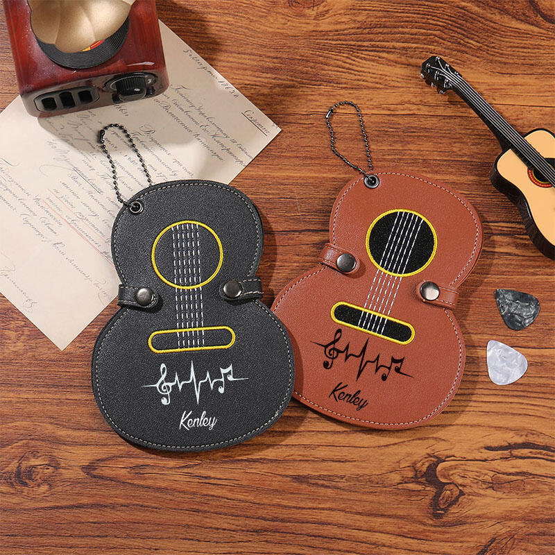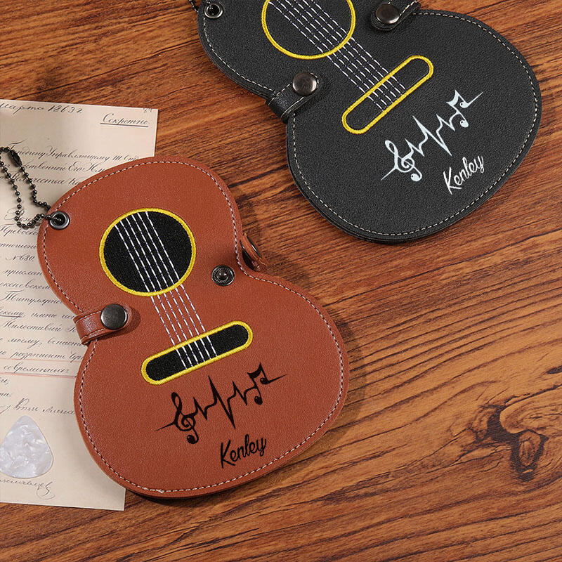 Porta púas de guitarra con nombre personalizado y símbolos musicales. Un regalo interesante para los amantes de la música.