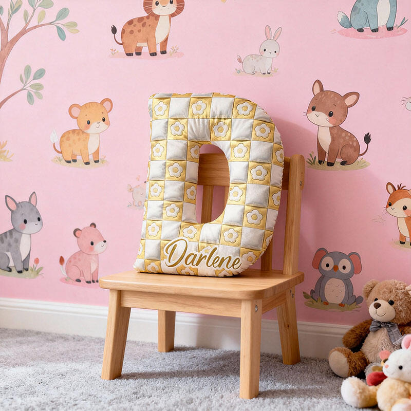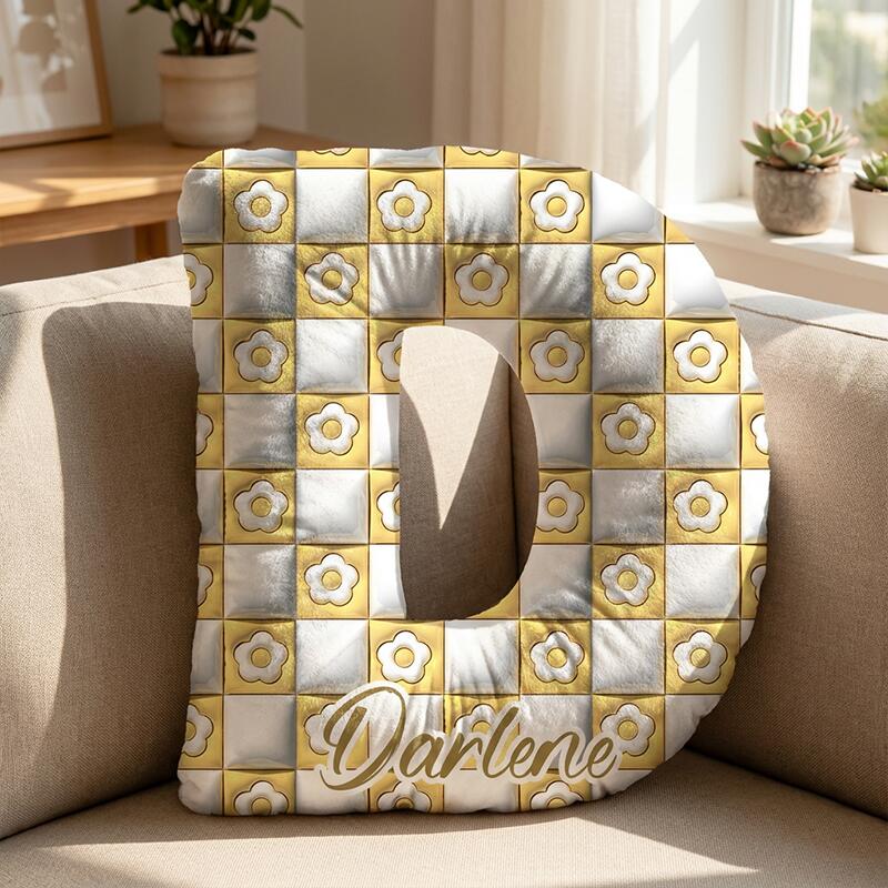 Almohada con nombre personalizada y estampado floral blanco. Regalo sencillo para niños.