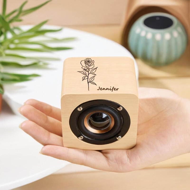 Altavoz Bluetooth de madera personalizado con nombre personalizado y flor de cumpleaños. Regalo para cumpleaños.
